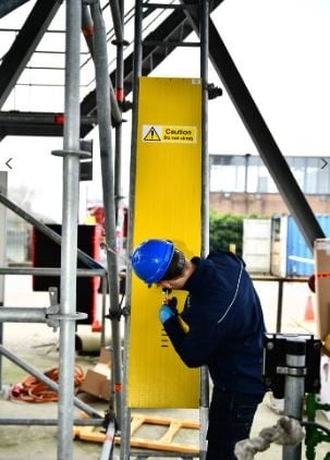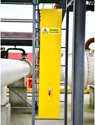 CableSafe Ladder Guard wird verwendet, um unbefugten Zugang zu einer Leiter zu verhindern.