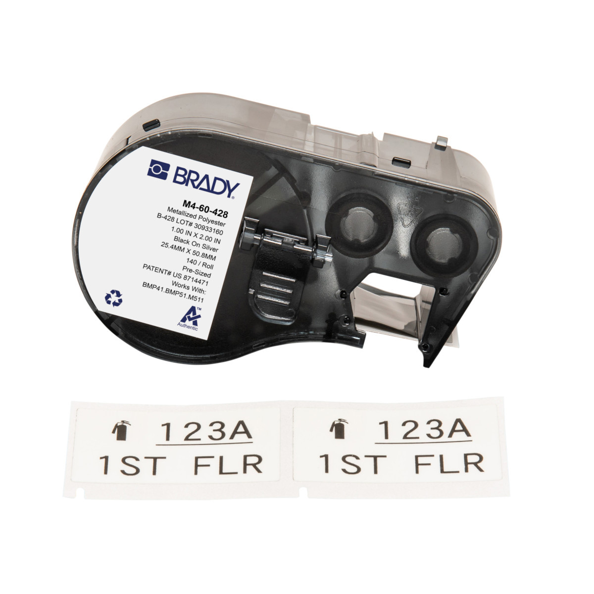 Erstellen Sie beständige Typenschilder für die Inventar- und Produktkennzeichnung mit dem B-428 Etikettenmaterial aus metallisiertem Polyester und einem flexiblen, stark haftenden Klebstoff