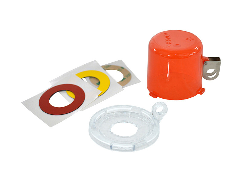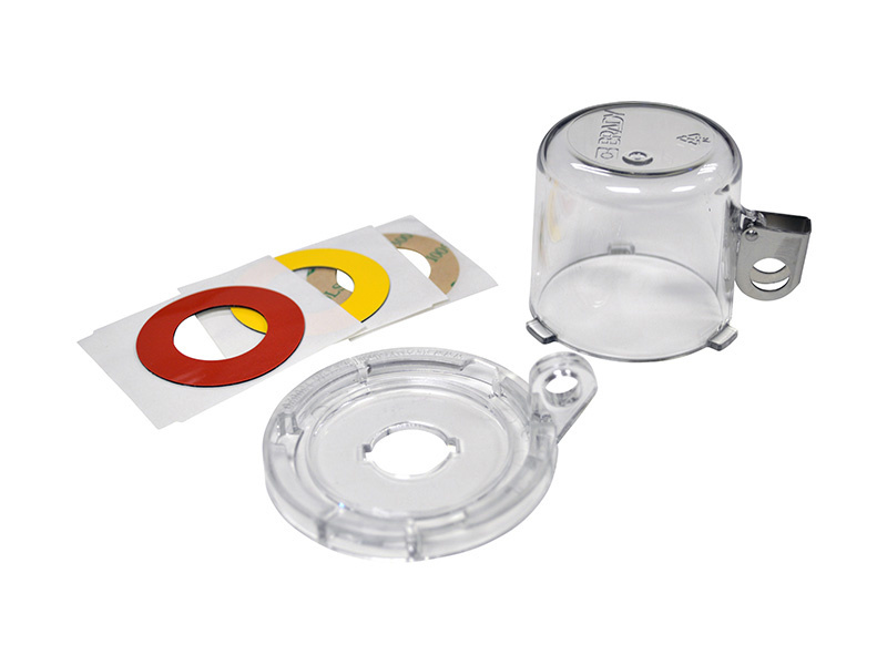Mithilfe der drehbaren Abdeckung kann der Zugang zu ein/aus- Schaltern und Notausschaltern von Geräten in Betriebsanlagen vorübergehend gesperrt werden.